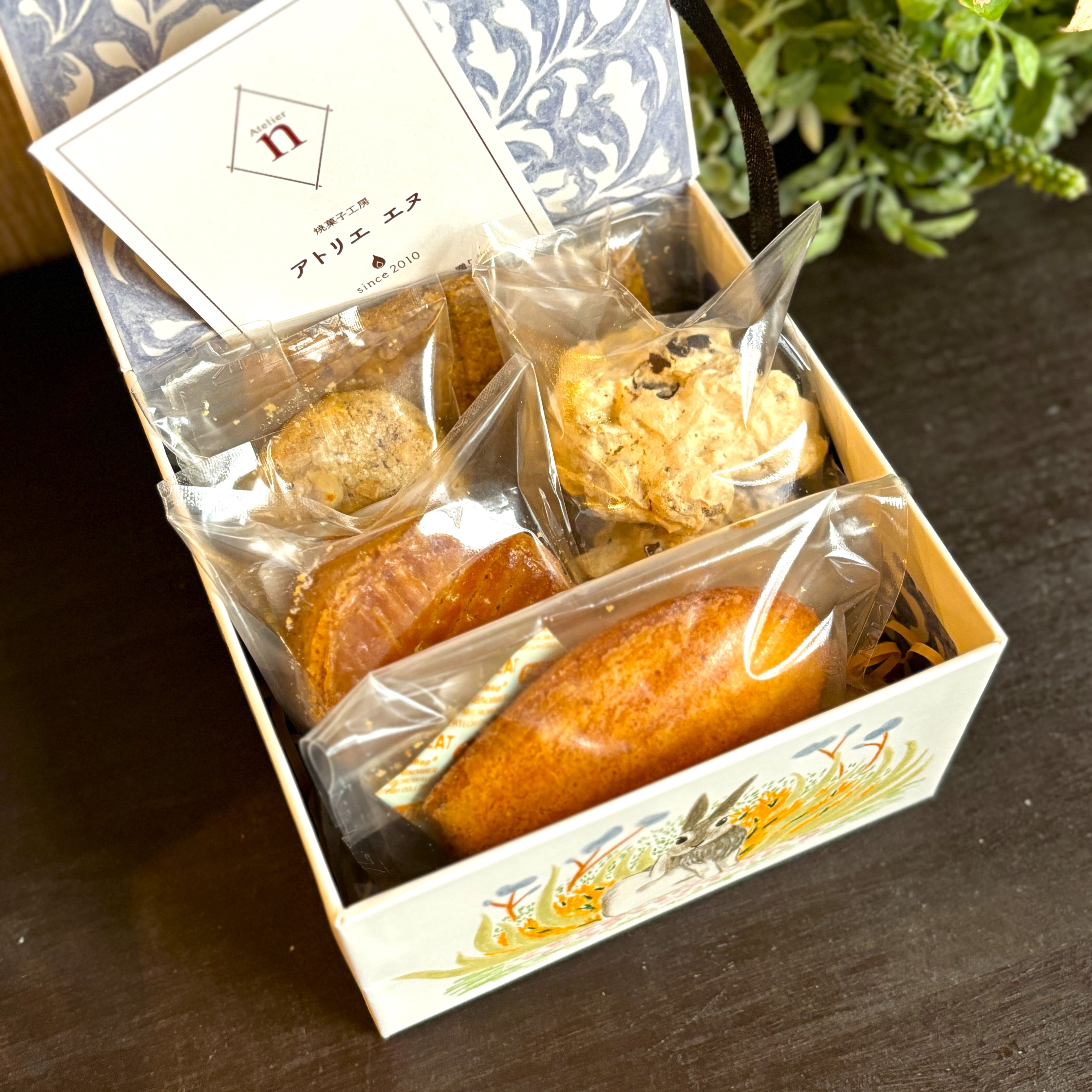 ◆アトリエ エヌのスタッフおすすめの焼き菓子5点入り!うさぎのイラストがかわいいギフトボックスです。
